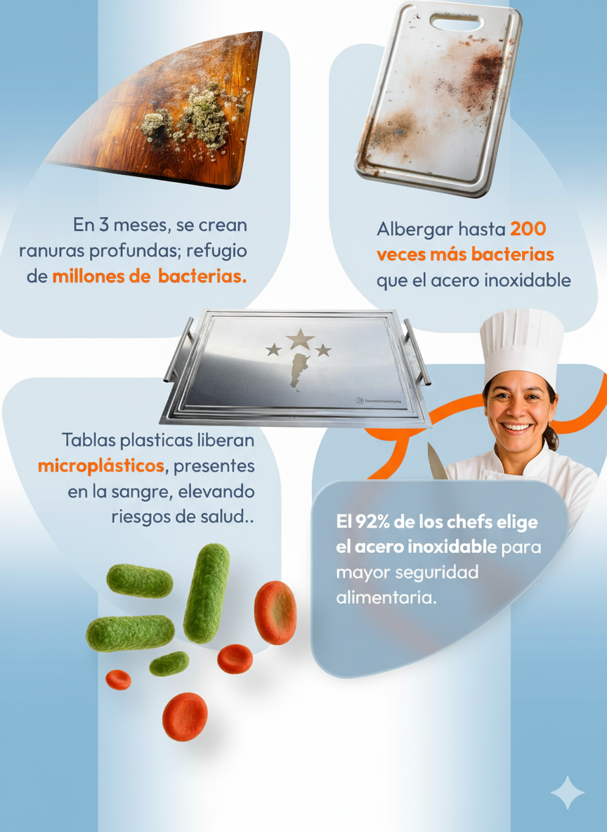 Cambiar a una tabla de cortar de acero grado médico es un paso clave, ya que reduce el riesgo de contaminación cruzada y elimina las preocupaciones sobre la ingestión de microplásticos.